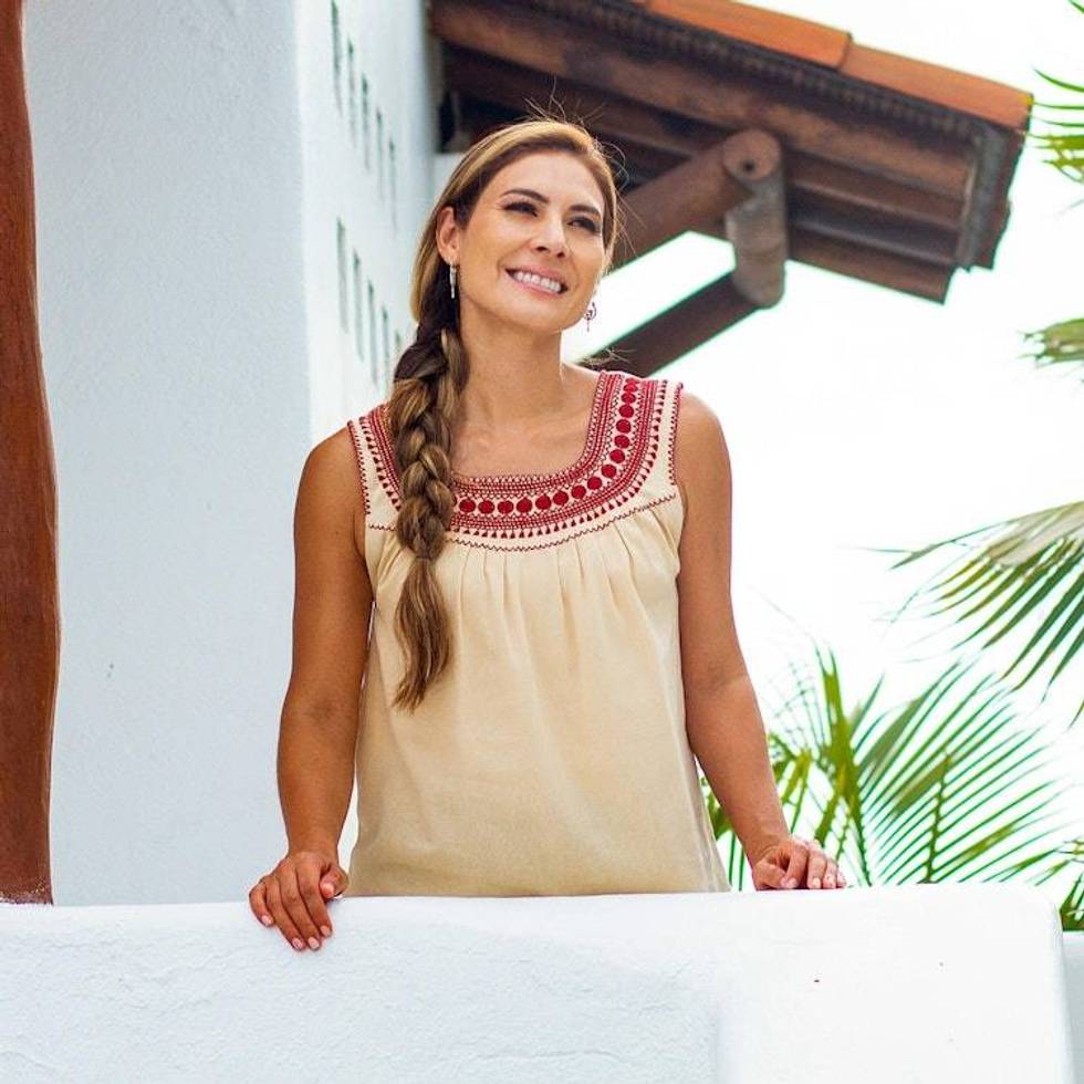Beige Cotton Blouse with Traditional Red Embroidery 'San Cristobal Tradition' Item ID: 2676647225