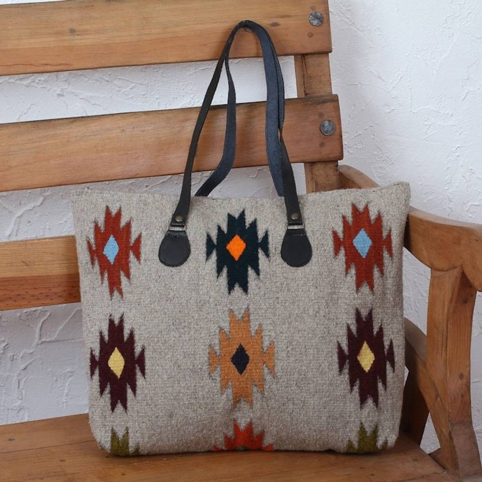 Beige with Earth-Color Geometric Motif Handwoven Wool Tote 'Forest Fanfare' Item ID: 2669926758