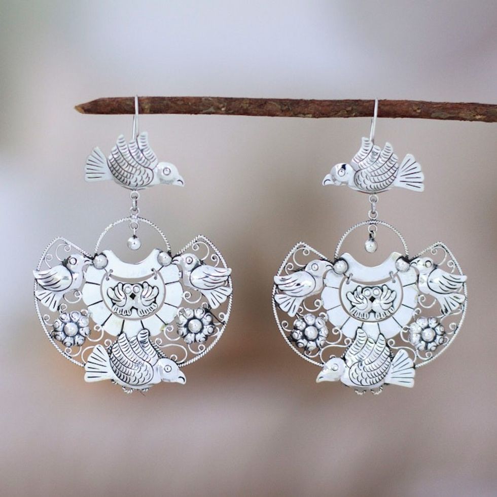 Bird and Floral-Themed Sterling Silver Statement Earrings 'Elysium Aura' Item ID: 2671807607