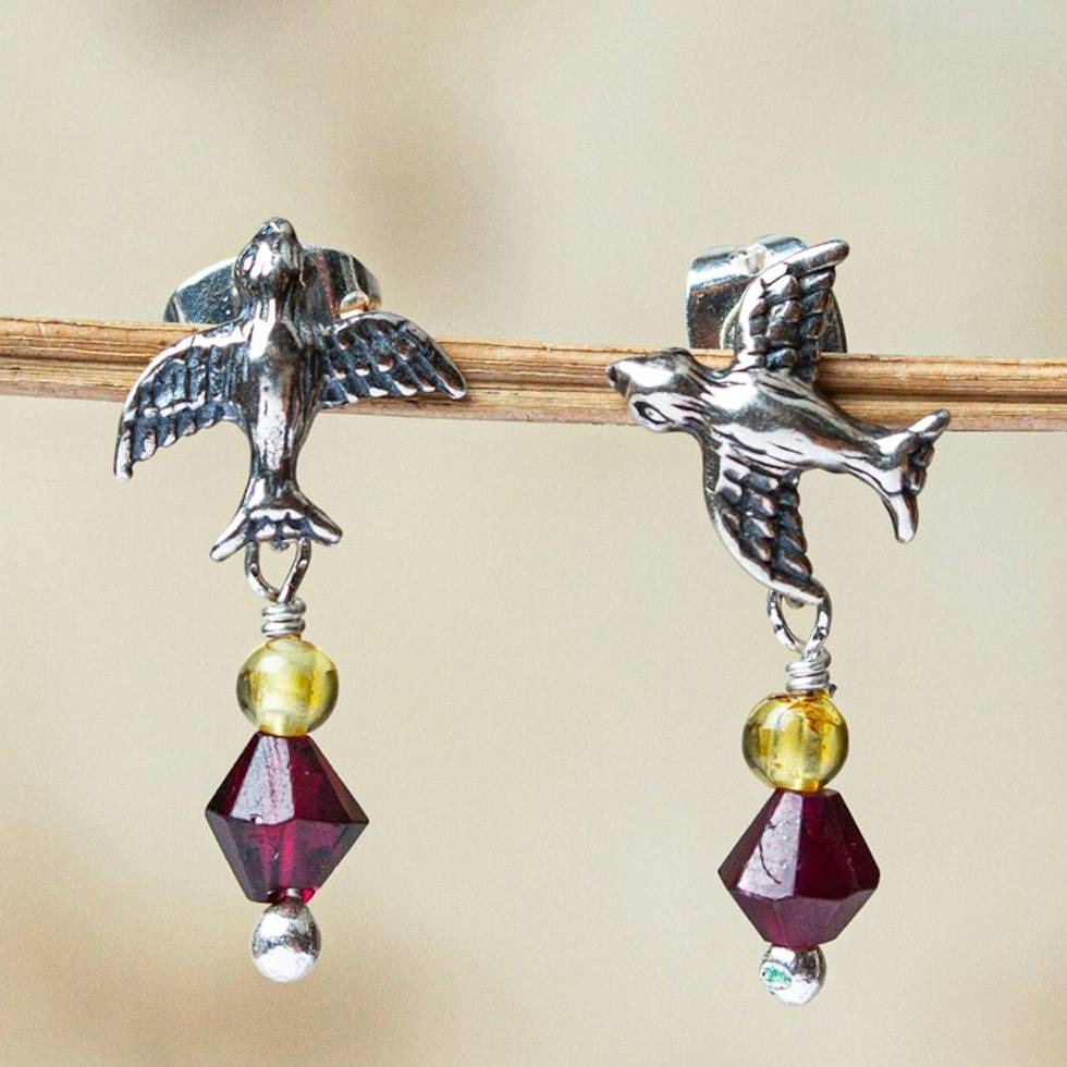 Bird Motif Garnet and Amber Earrings 'Swallow's Treasure' Item ID: 2671808473