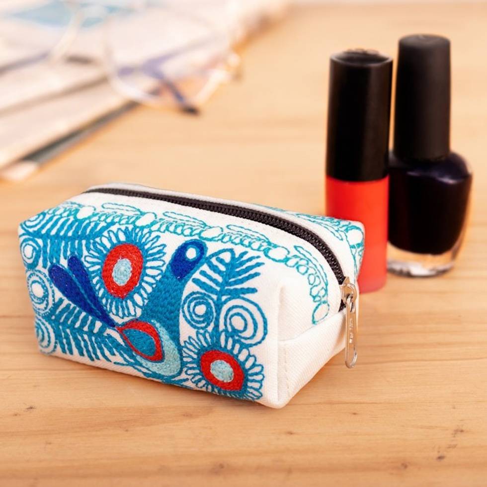 "Complete your days with a cosmetic bag of ethereal allure, crafted by the Andean Travel & Adventure Association. Peruvian artisans use acrylic and embroidery techniques to portray a serene scene in this convenient design, where bird and floral details come to life, spreading blue and white hues. As a convenient accent, a zipper closure crowns the piece."