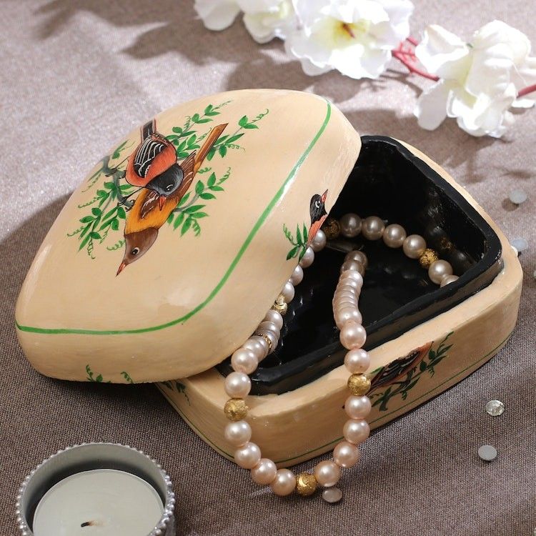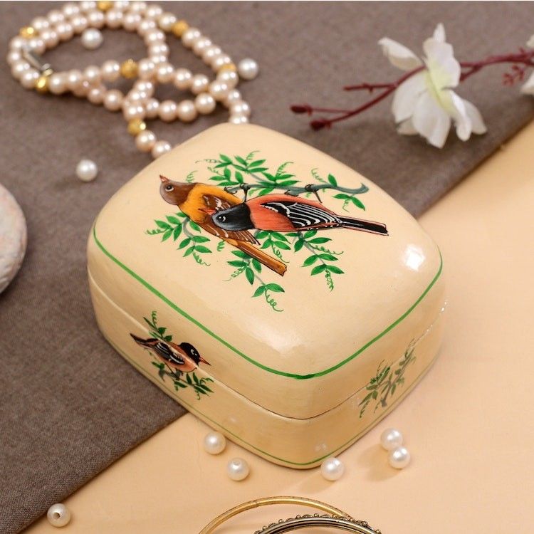 Bird-Themed Green and Ivory Papier Mache Decorative Box 'Bird Saga' Item ID: 2671781706