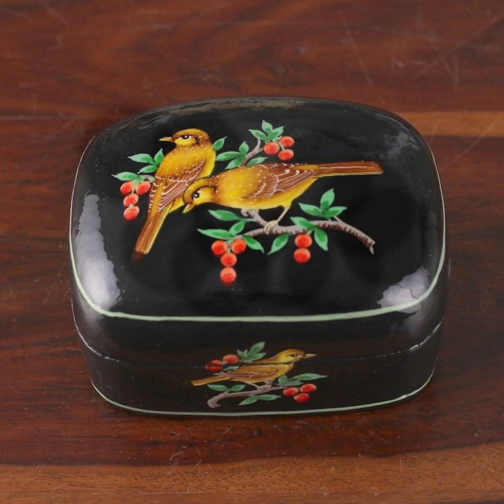 Bird-Themed Hand-Painted Black Papier Mache Decorative Box 'Our Night' Item ID: 2671782064