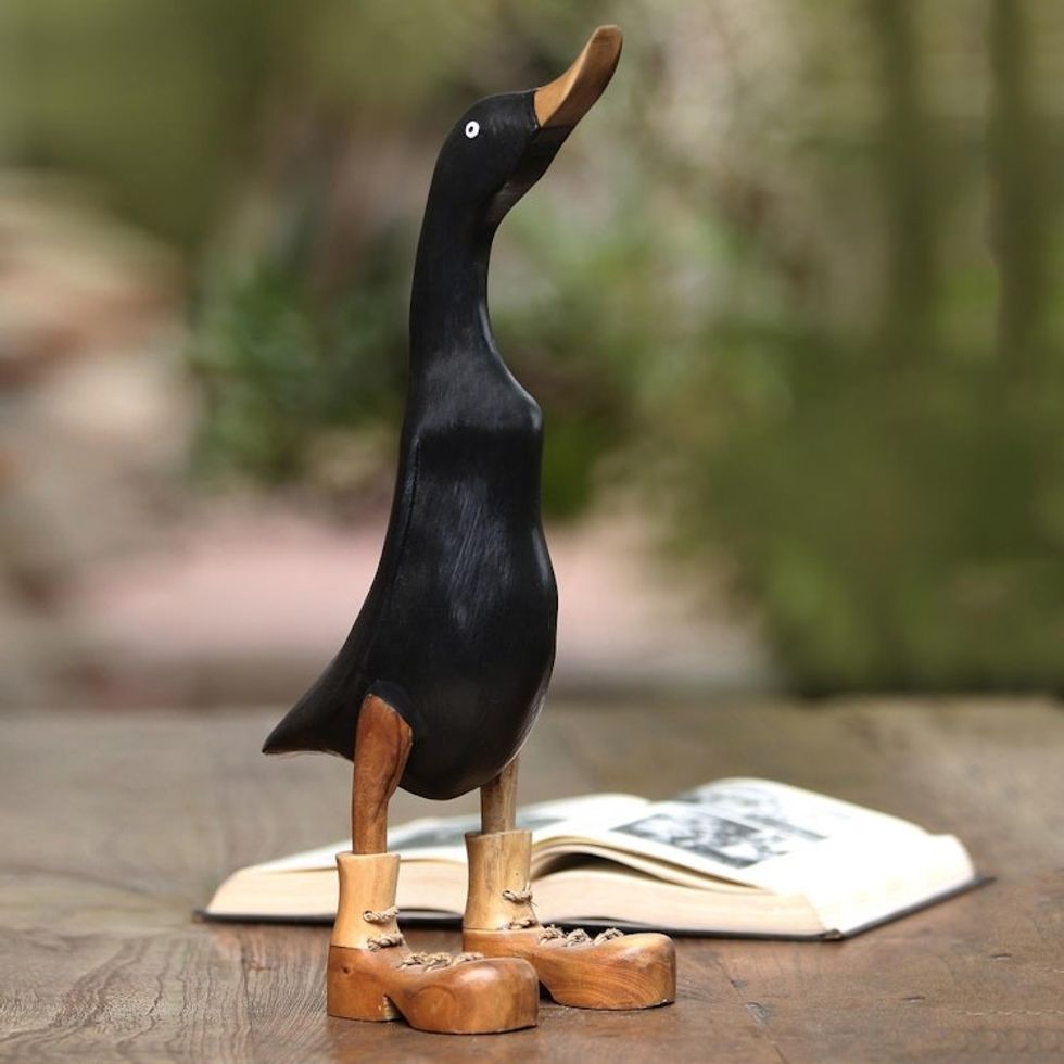 Black Acacia Wood and Bamboo Root Duck Sculpture from Bali 'Stomping Duck in Black' Item ID: 2671736820
