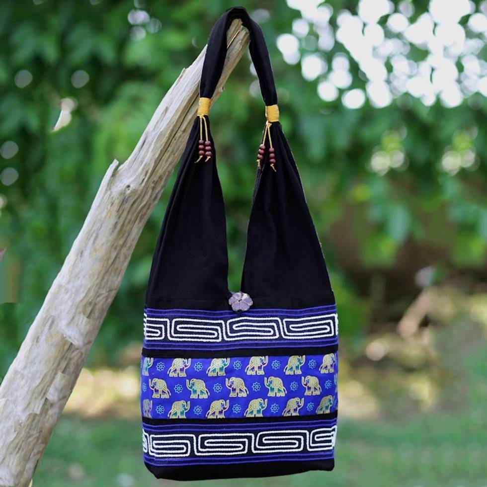 Black and Blue Cotton Blend Shoulder Bag from Thailand 'Thai Siam' Item ID: 2669894192