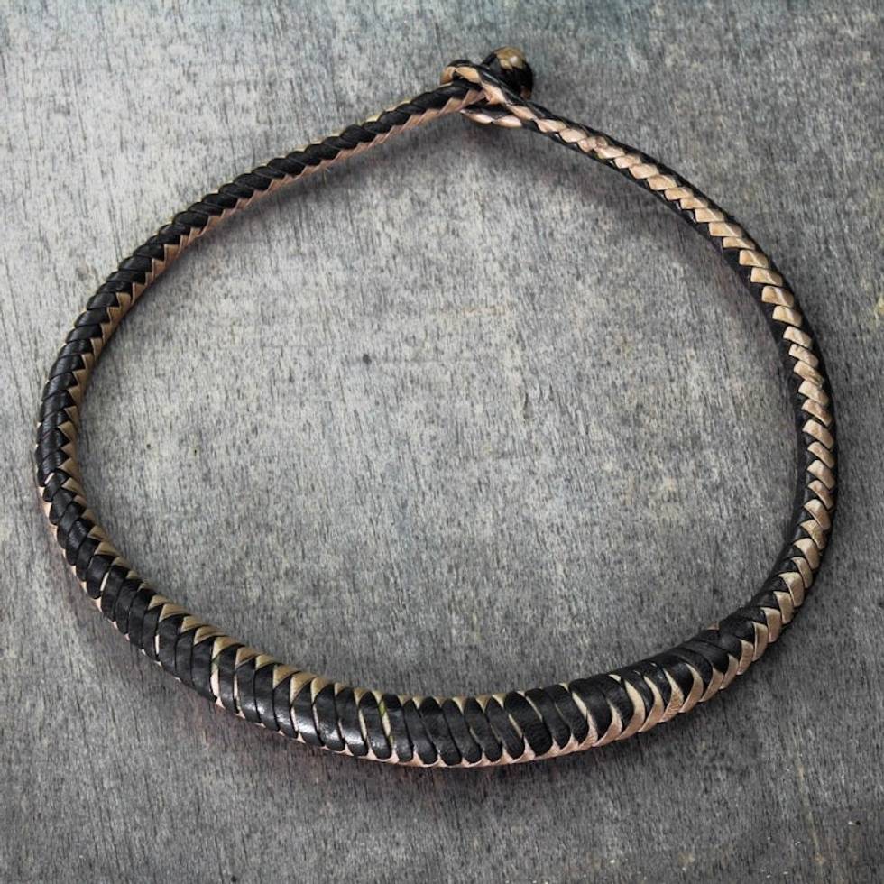 Black and Brown Hand-Braided Leather Necklace from Ghana 'Mpusia' Item ID: 2671805752