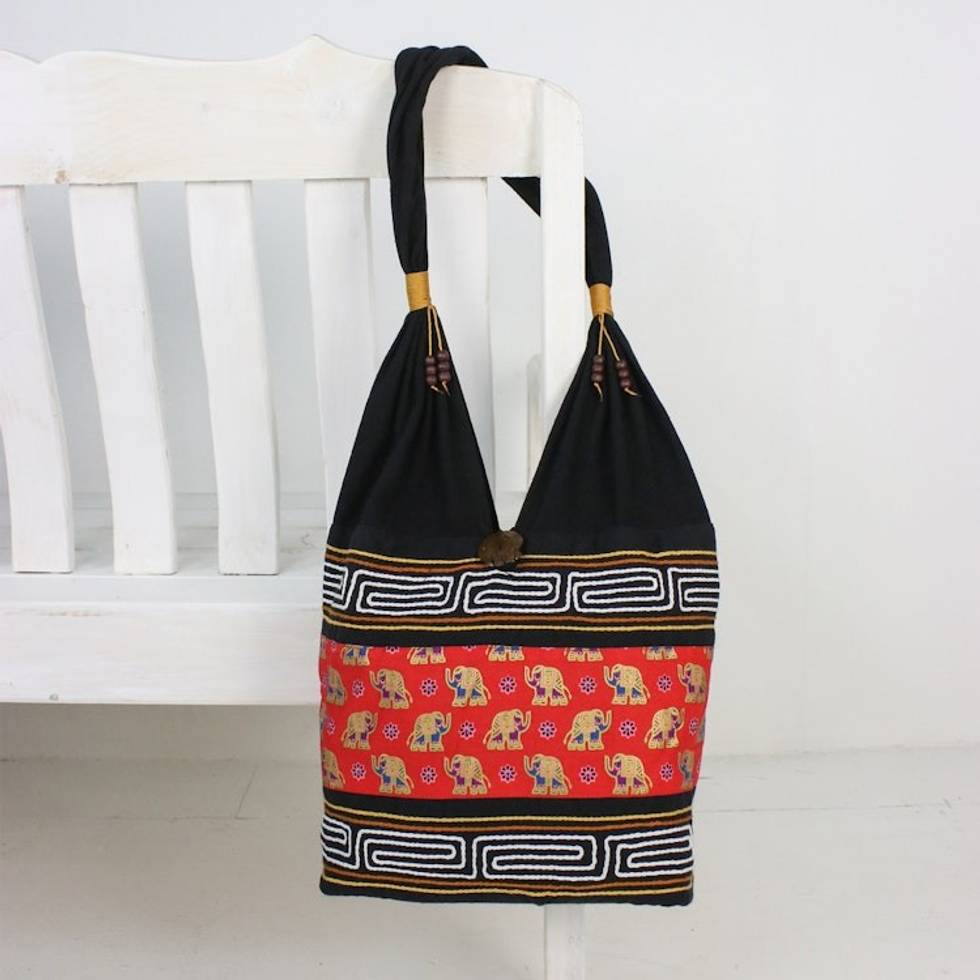 Black and Crimson Cotton Blend Shoulder Bag from Thailand 'Thai Siam in Crimson' Item ID: 2671801022