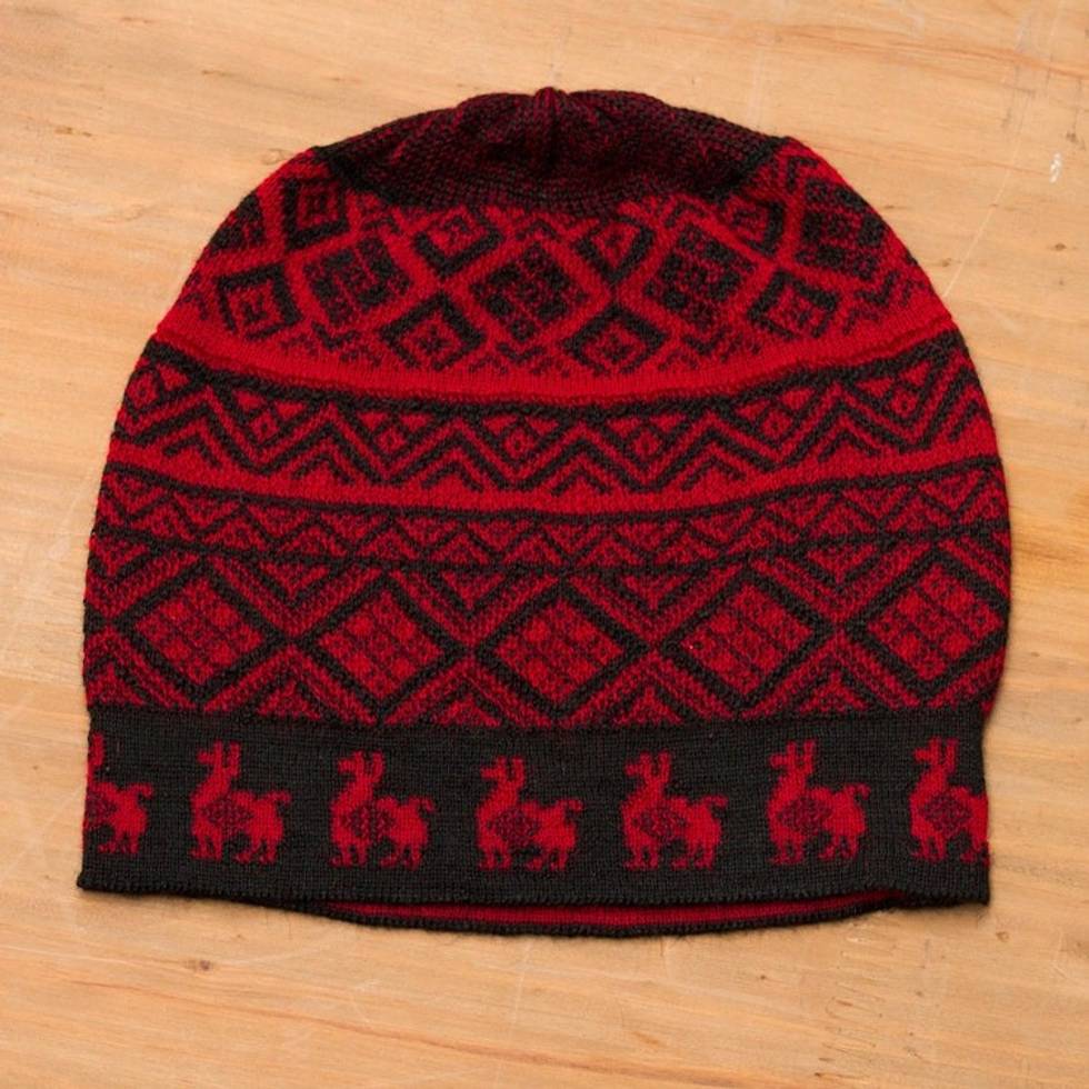 Black and Crimson Red Diamond Motif Alpaca Blend Knit Hat 'Alpaca Parade in Red' Item ID: 2669908173