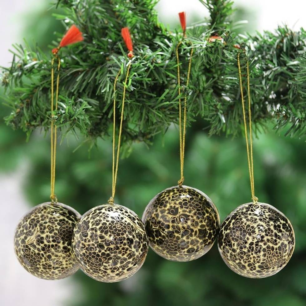 Black and Gold Floral Papier Mache Ornaments Set of 4 'Holiday Blossoms in Black' Item ID: 2671789521