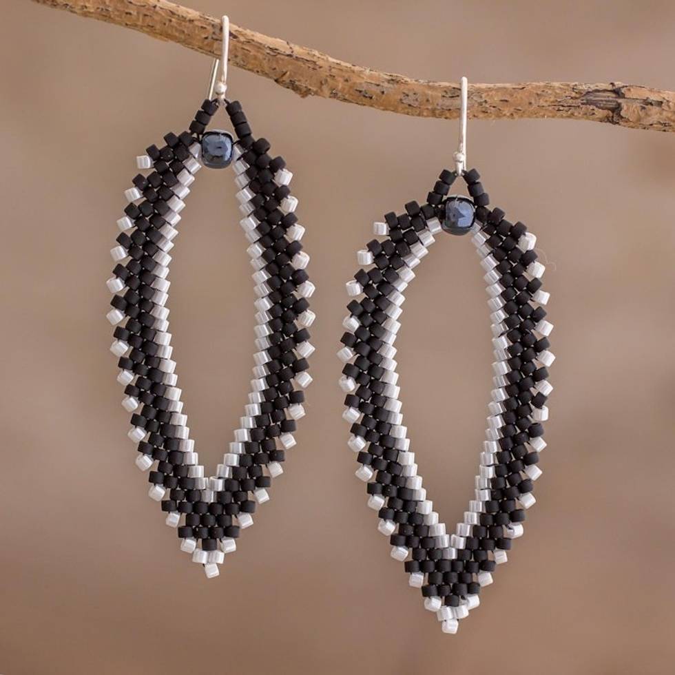 Black and Grey Leaf-Shaped Beaded Dangle Earrings 'Leaves at Nightfall' Item ID: 2669934155