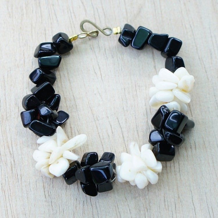 "Harriet Faako Adjei creates this stunning beaded bracelet from agate chips that is perfect for a bold look. Crafted by hand in Ghana, the bracelet features dozens of dainty agate chips in off-white and jet black fastened together in an eye-catching design."