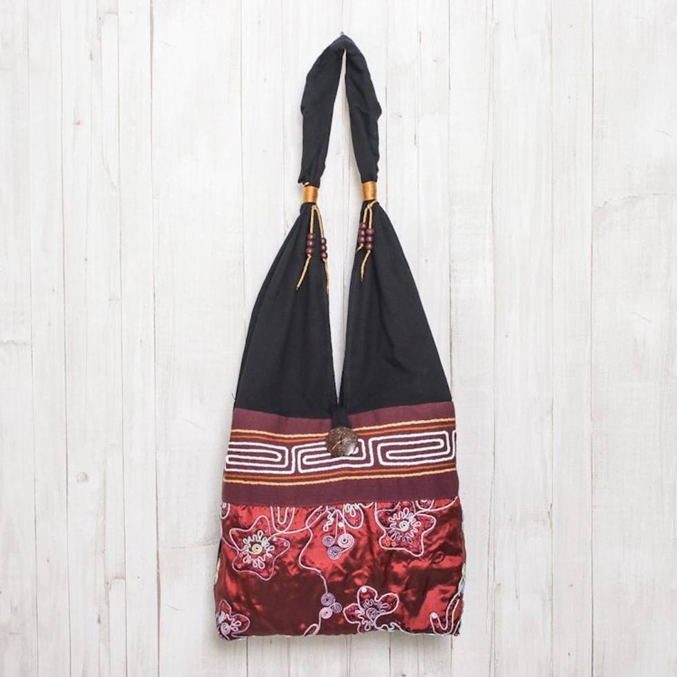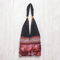 Black and Red Cotton with Floral Pattern Shoulder Bag 'Glittering Red Flower' Item ID: 2671799252