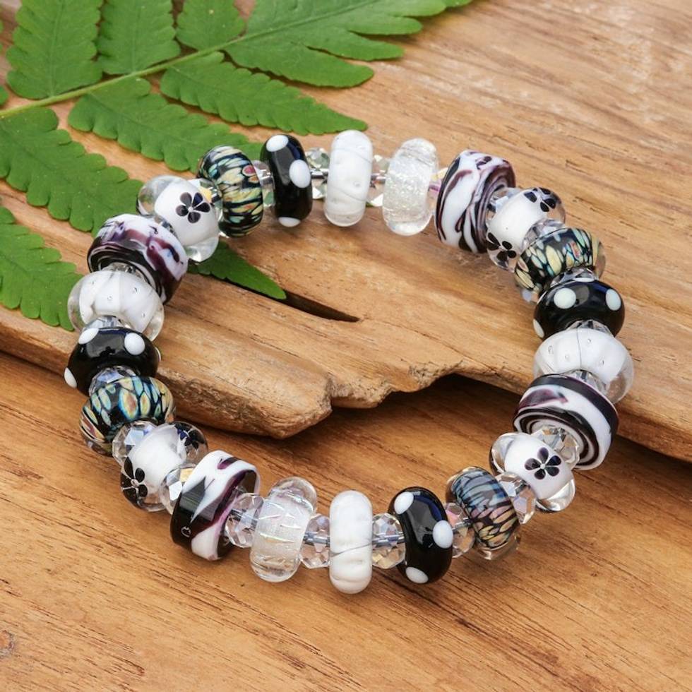 Black and White Blown Glass Crystal Beaded Stretch Bracelet 'Sublime Spell' Item ID: 2671797055