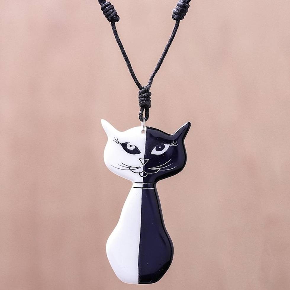 Black and White Ceramic Cat Pendant Necklace from Thailand 'Black and White Cat' Item ID: 2671798611