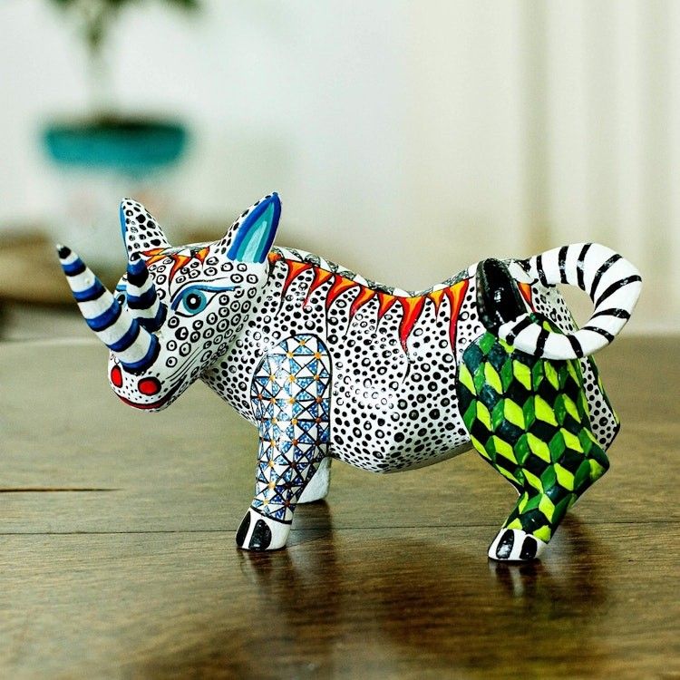 Black and White Rhinoceros Alebrije Wood Carving from Oaxaca 'Cautious Black and White Rhino' Item ID: 2671808089