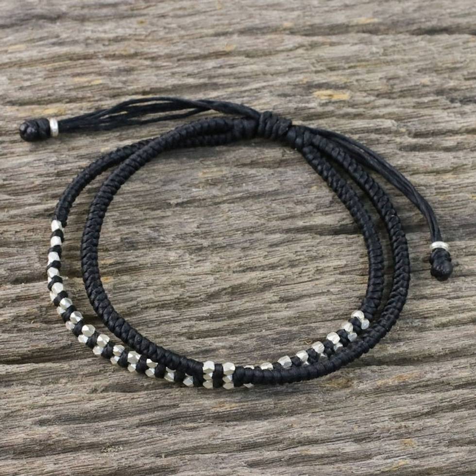 Black Braided Cord Bracelet with Silver 950 Beads 'Everyday Thai in Jet Black' Item ID: 2671801389