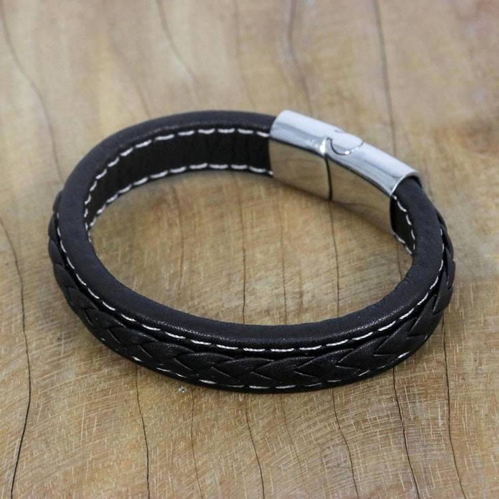 Black Braided Leather Wristband Bracelet from Thailand 'Worldly Spirit in Black' Item ID: 2676647577