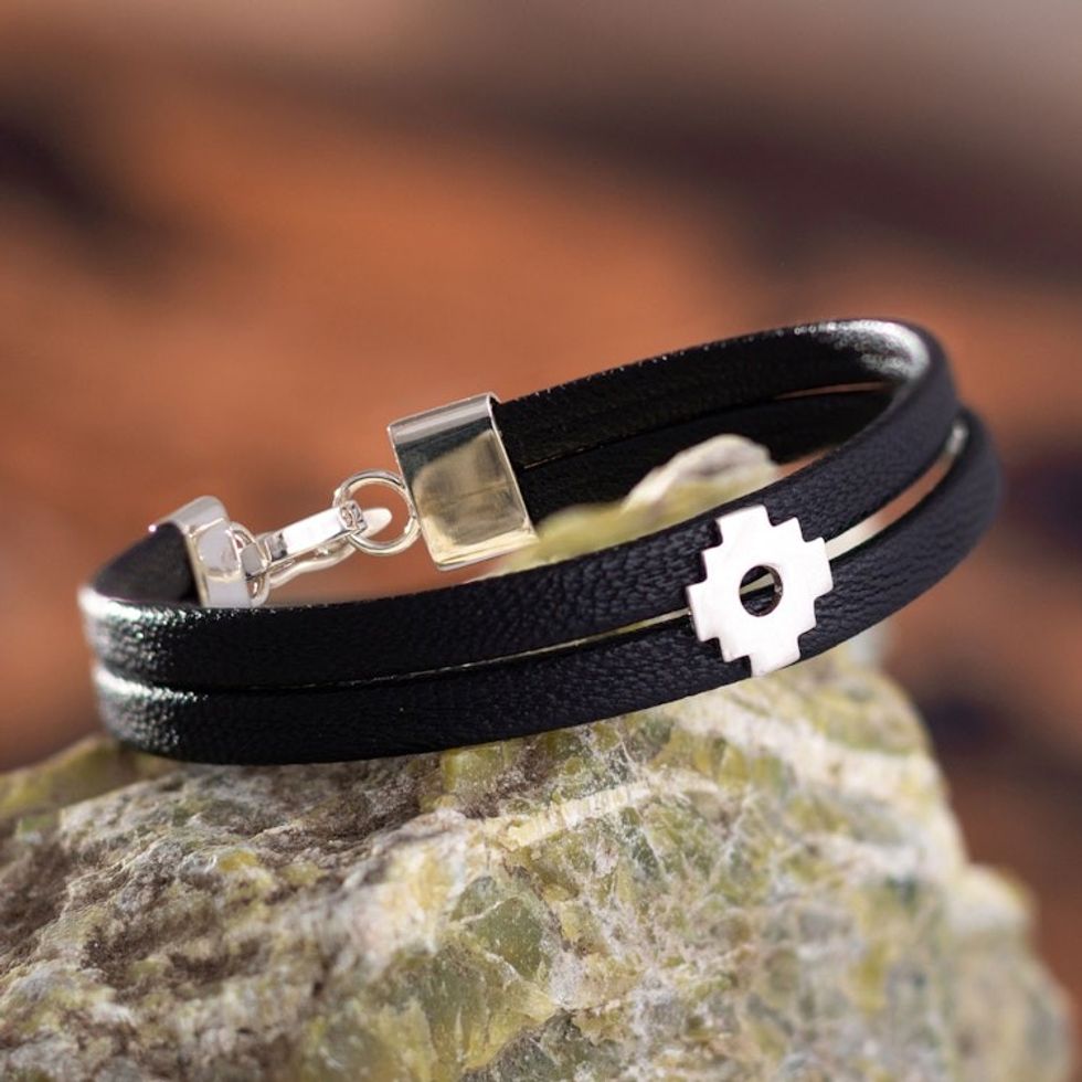 Black Faux Leather Chakana Bracelet with Sterling Silver 'Chakana Southern Cross' Item ID: 2671691337