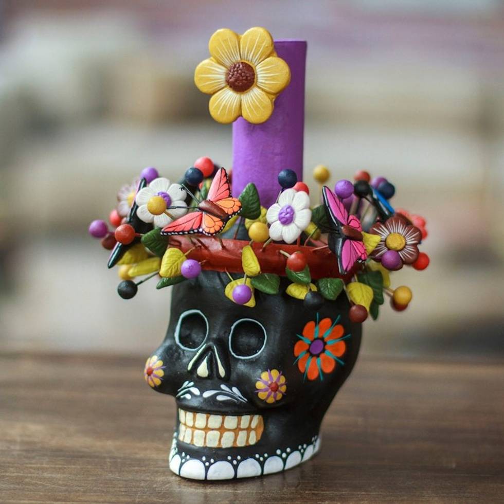 Black Floral Ceramic Skull Taper Candleholder 'Black Floral Skull' Item ID: 2671808484