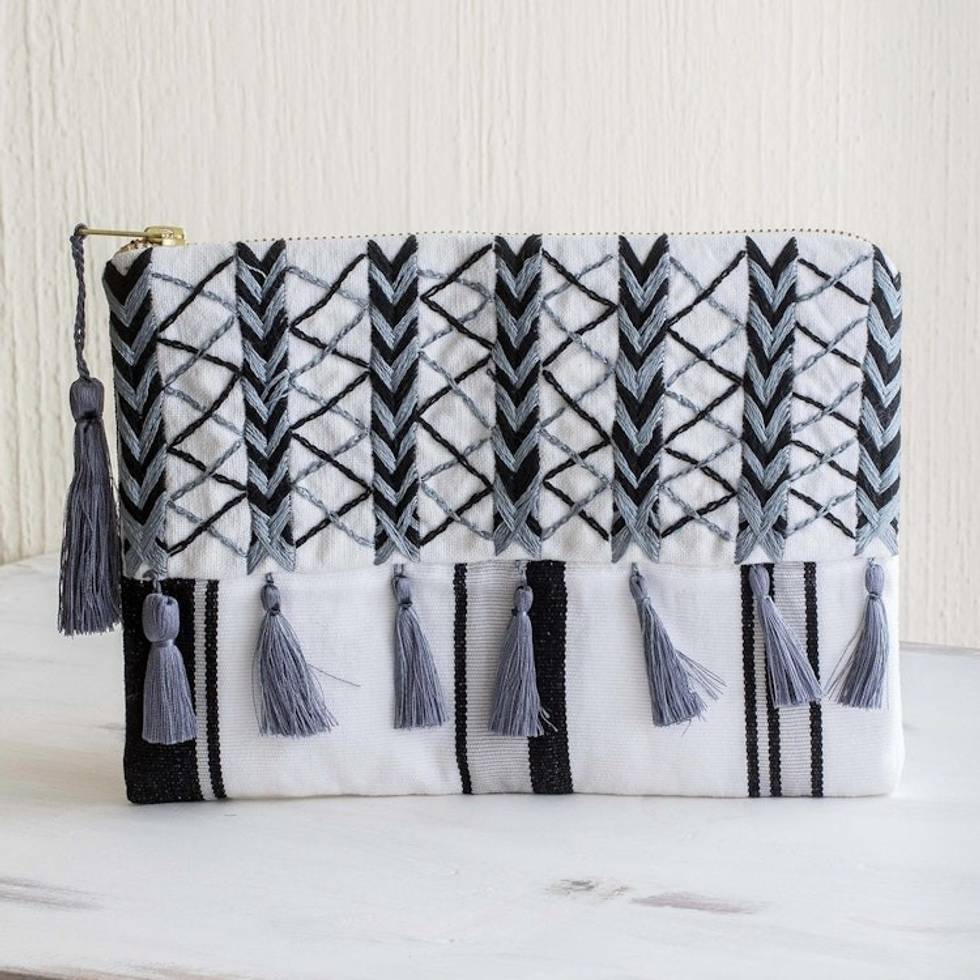 Black Grey Embroidered White Cotton Cosmetic Bag 'Monochrome Zigzags' Item ID: 2671776688