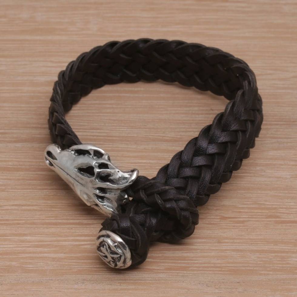 Black Leather and Sterling Silver Wristband Bracelet 'Dark Alligator' Item ID: 2671734305