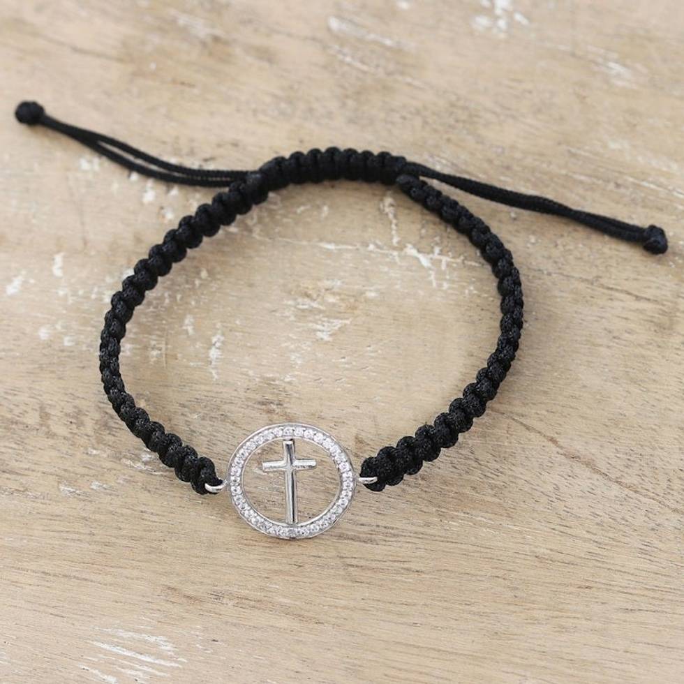 Black Macrame Cord Bracelet with Cross Pendant and Gems 'Bonds of Faith' Item ID: 2671786614