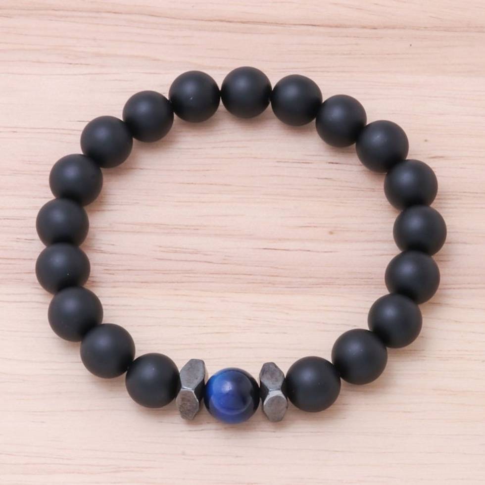 Black Onyx and Blue Tiger's Eye Beaded Stretch Bracelet 'Black Sky' Item ID: 2671799011
