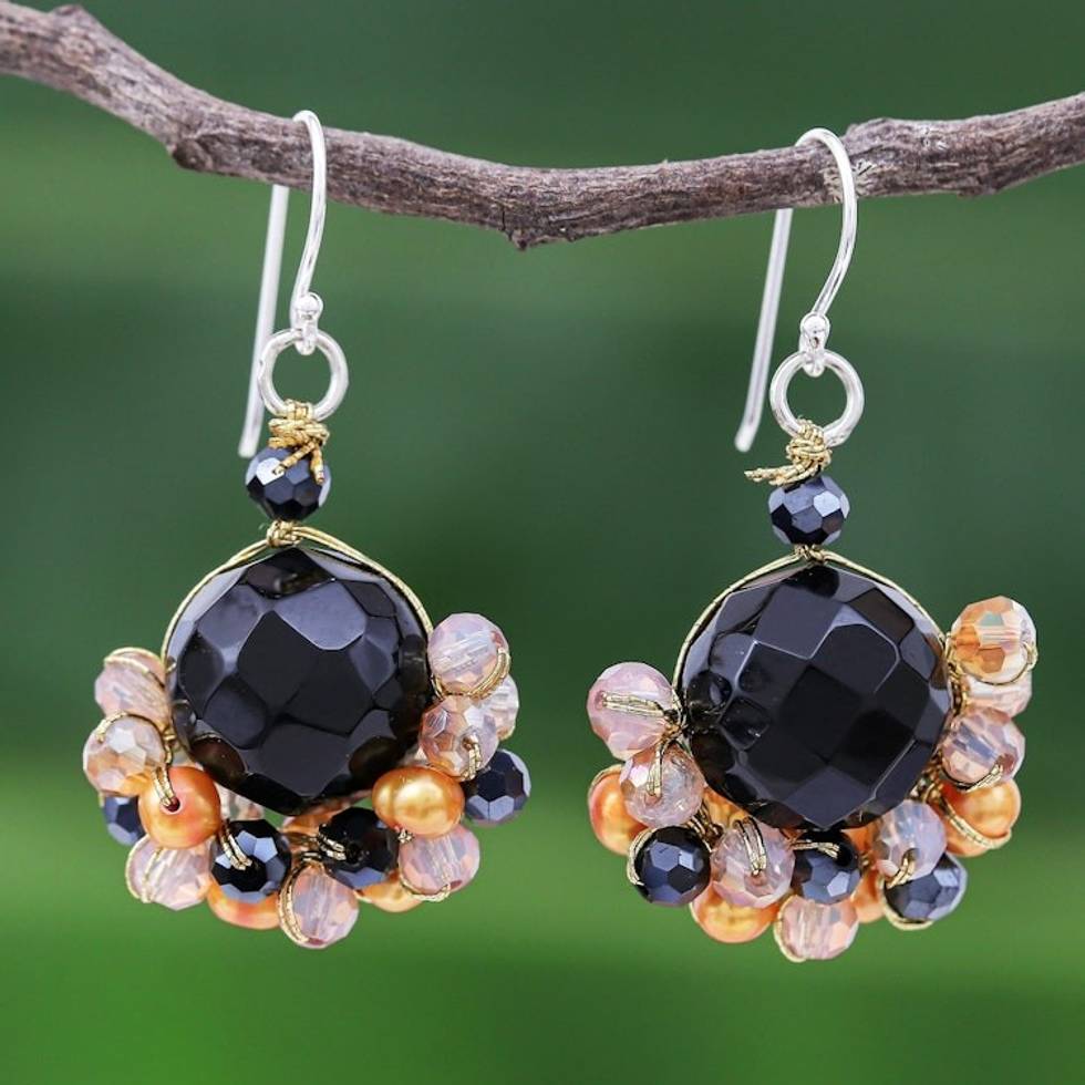 Black Onyx and Orange Freshwater Pearl Dangle Earrings 'Vivid Dream in Orange' Item ID: 2671800390
