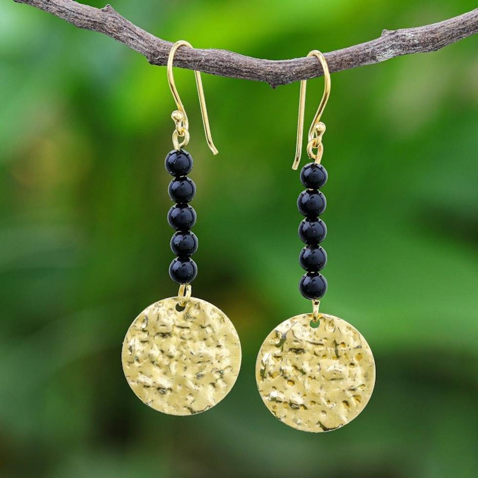 Black Onyx Bead and Brass Coin Dangle Earrings 'Golden Coin in Midnight' Item ID: 2669927310