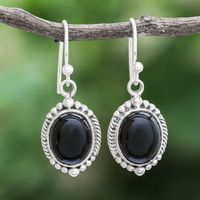 Black Onyx Cabochon Sterling Silver Dangle Earrings 'Cool Moon' Item ID: 2669926106