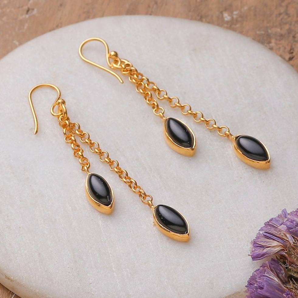 Black Onyx Gem Dangle Earrings Bathed in 22k Gold Plating 'Midnight Gala Seeds' Item ID: 2671781232