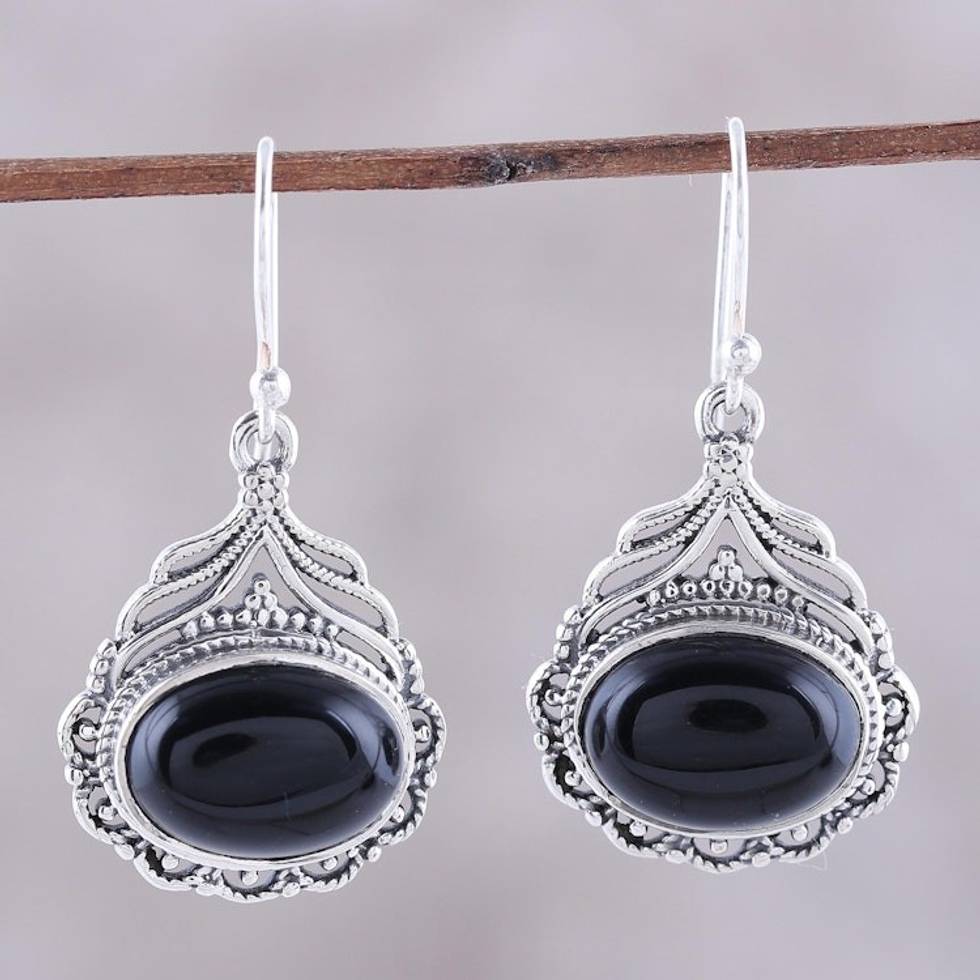 Black Oval Onyx Dangle Earrings from India 'Jeweled Glory' Item ID: 2669923802