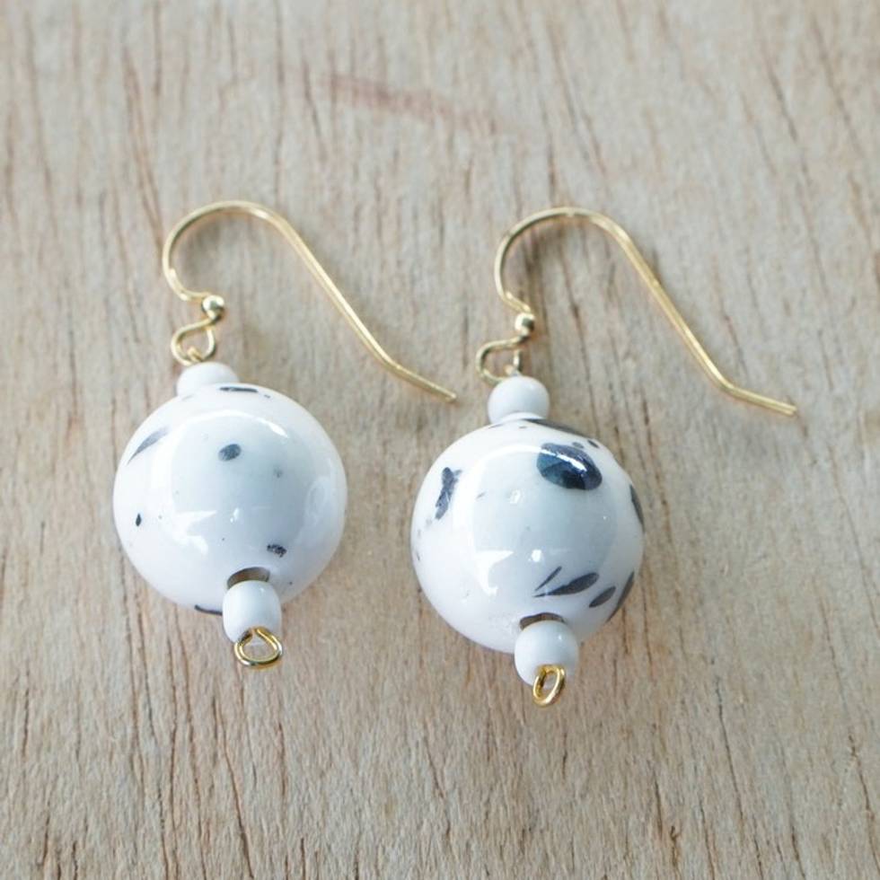 Black-Speckled White Recycled Glass Beaded Dangle Earrings 'Moon Twin' Item ID: 2671805319