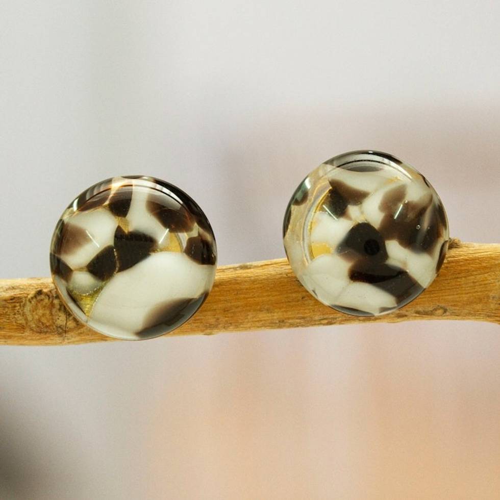 Black White Fused Glass Mosaic Button Earrings from Mexico 'Black White Textures' Item ID: 2671640335