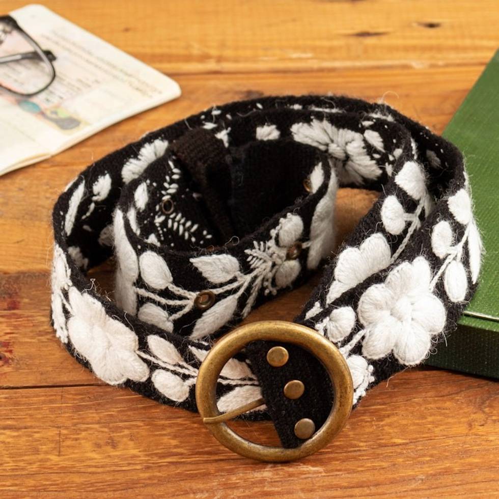 Black White Hand-Woven Hand-Embroidered Floral Wool Belt 'White Flowers' Item ID: 2669904211
