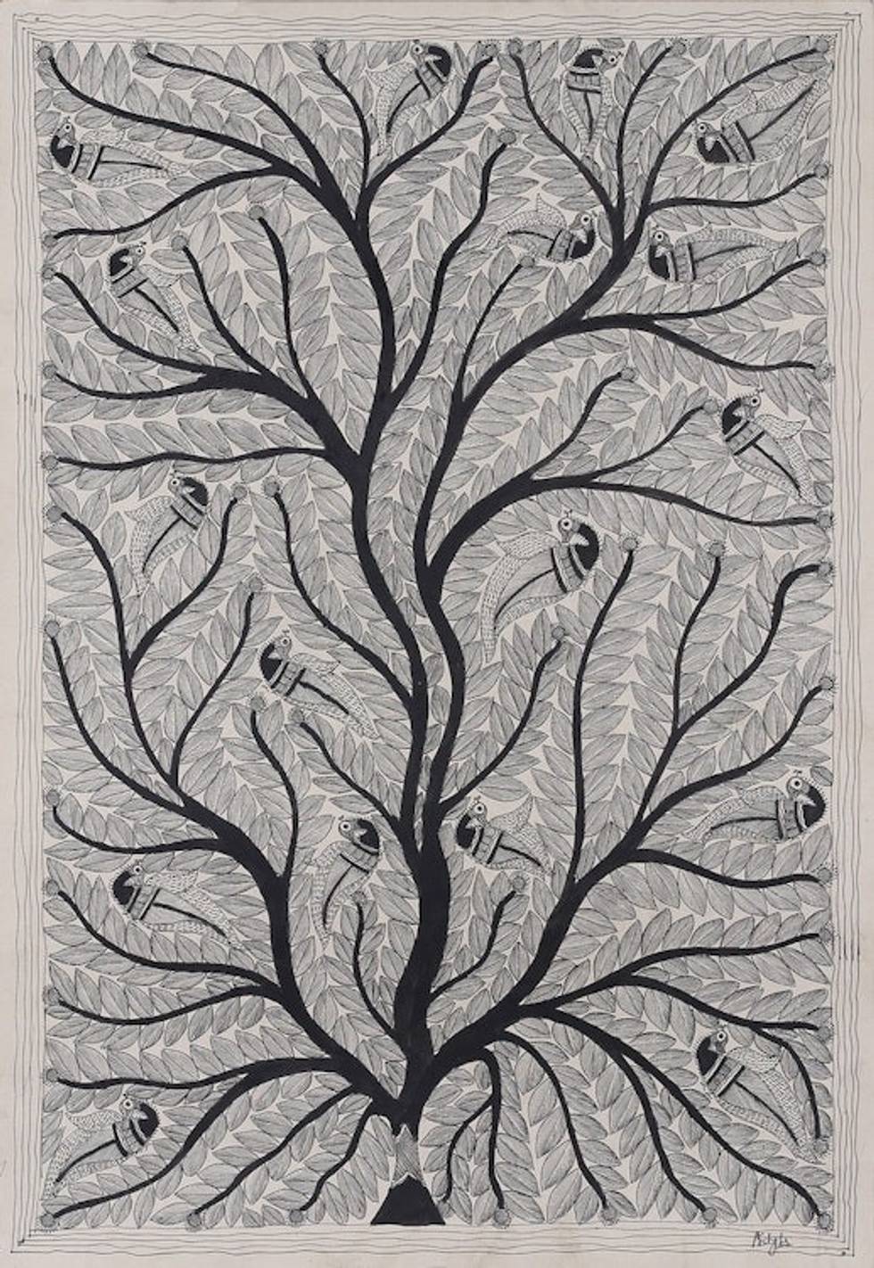 Black White Madhubani Painting of Tree with Exotic Birds 'Black White Tree...' Item ID: 2671783120