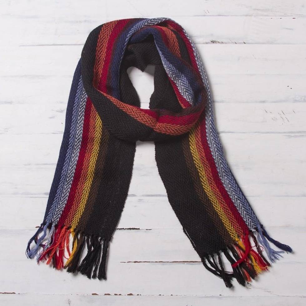 Black with Colorful Stripes Handwoven 100 Alpaca Scarf 'Mountain Evening' Item ID: 2671403543
