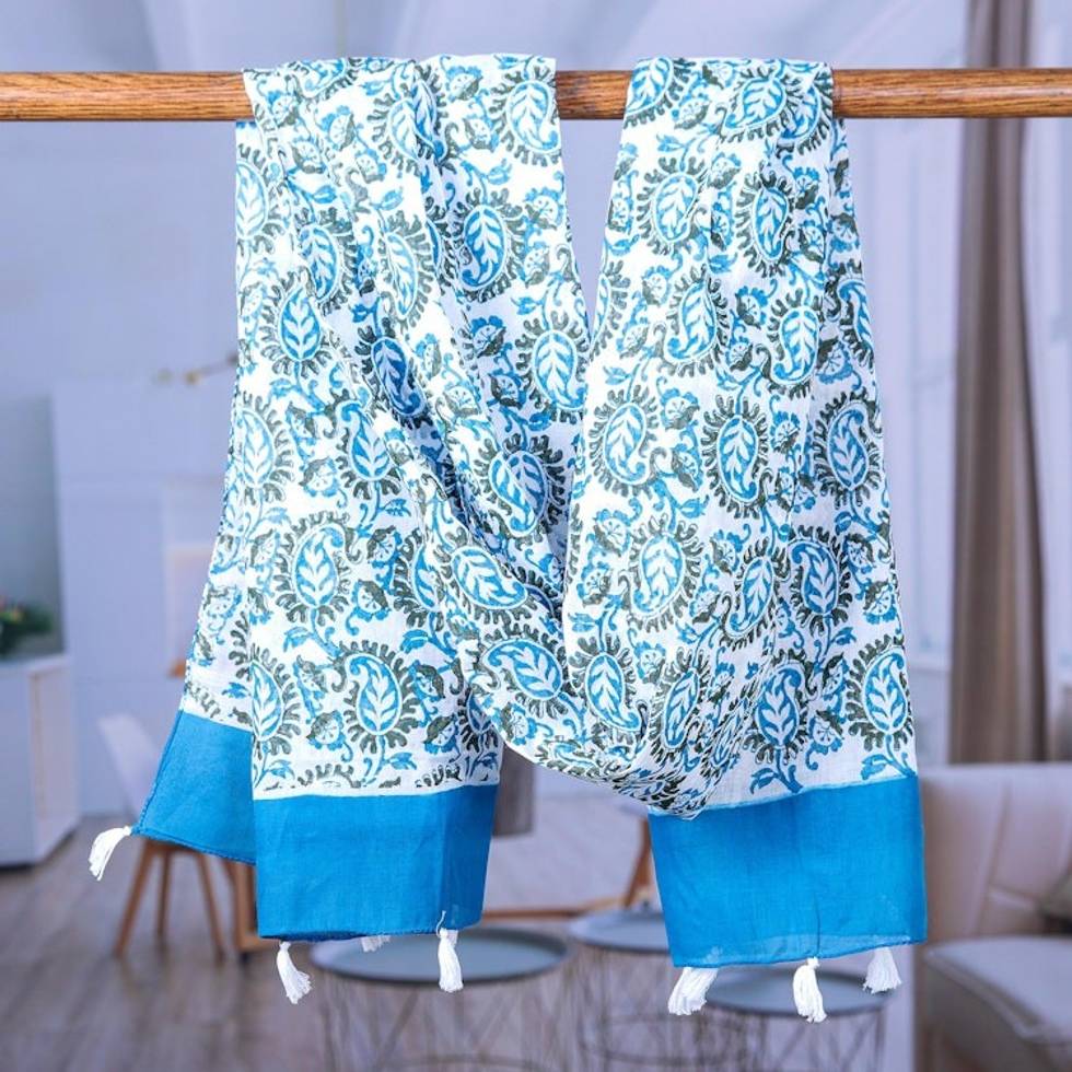 Block-Printed Cotton Scarf with Azure Paisley Pattern 'Paisley Heaven' Item ID: 2669942088