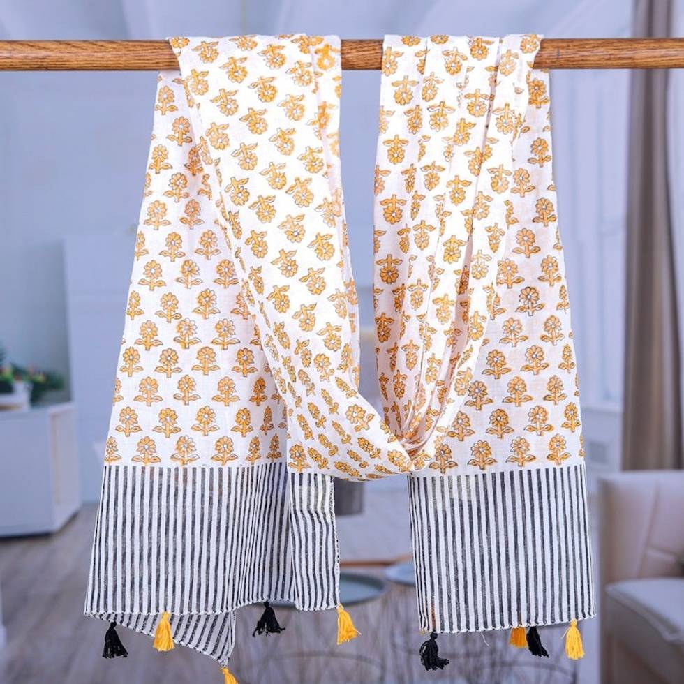 Block-Printed Cotton Scarf with Floral and Striped Motifs 'Goldenrod Meadow' Item ID: 2669925021