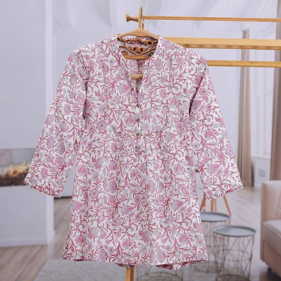 Block-Printed Floral Pink and Red Cotton Tunic from India 'Dulcet Spring' Item ID: 2669892164