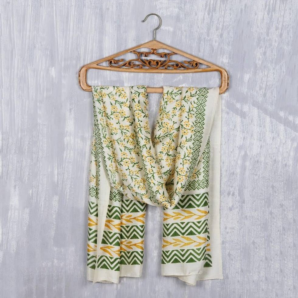 Block-Printed Floral Silk Wrap Scarf from India 'Autumn Flowers' Item ID: 2669923931