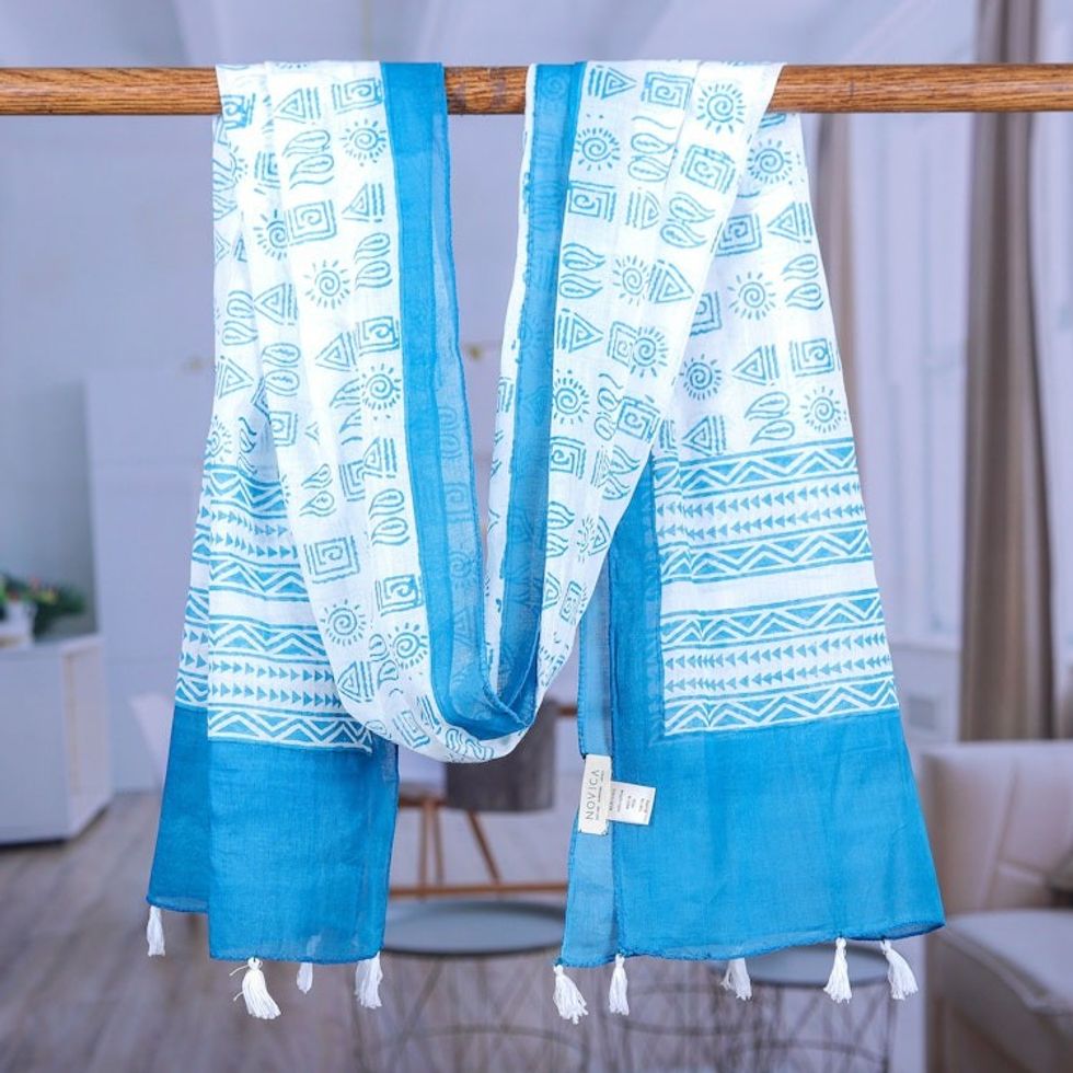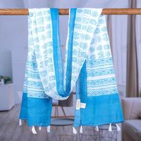 Block-Printed Teal Cotton Scarf with White Tassels 'Teal Mosaic' Item ID: 2669955542
