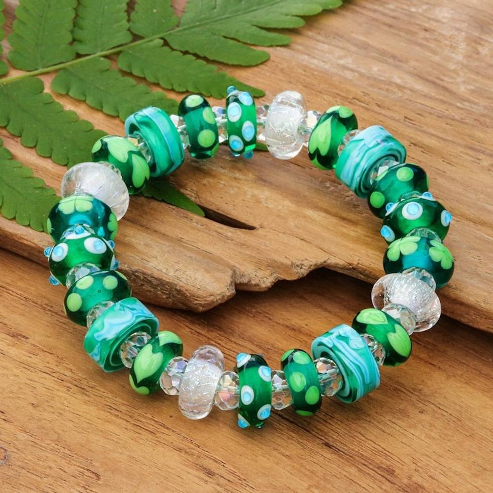 Blown Glass Crystal Beaded Stretch Bracelet in Green Shade 'Verdant Spell' Item ID: 2671796856