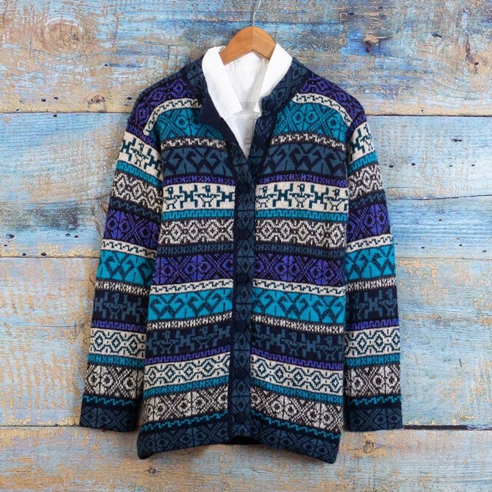 Blue Alpaca Blend Cardigan with Inca Motifs 'Empire Memories' Item ID: 2669907299