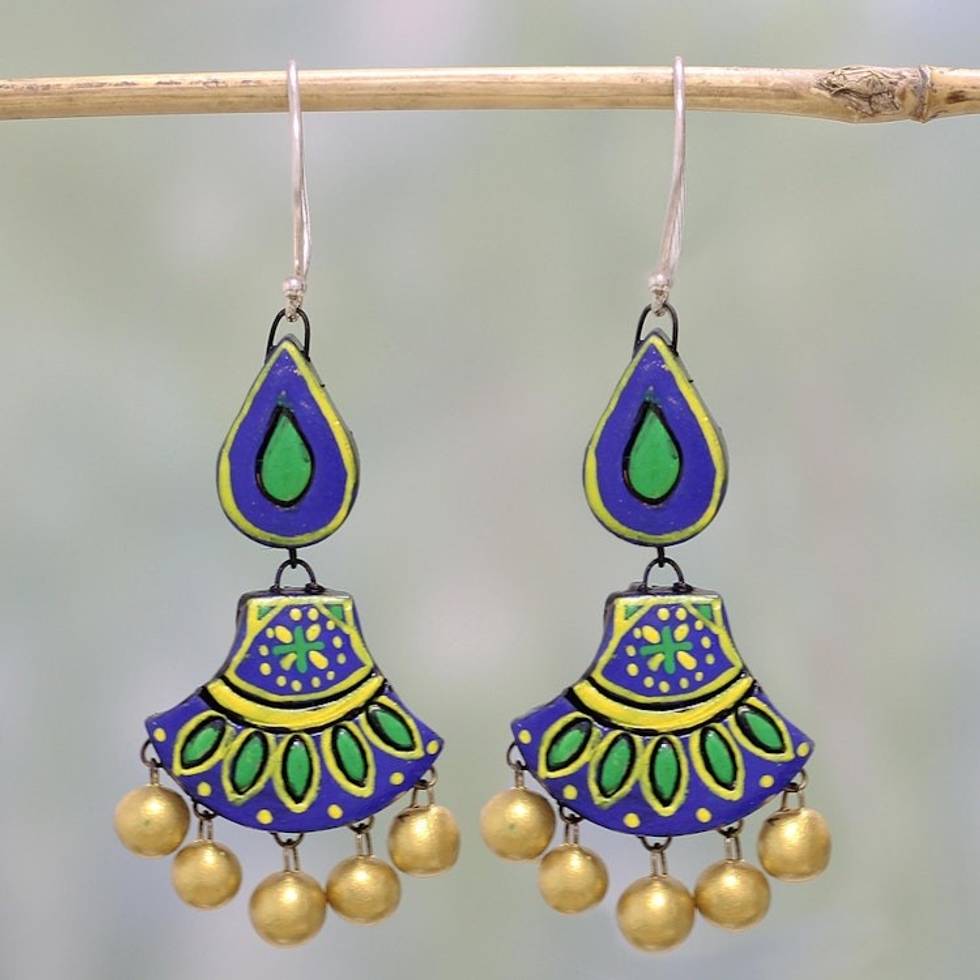 Blue and Green Ceramic Dangle Earrings by Indian Artisans 'Royal Rainfall' Item ID: 2671620098