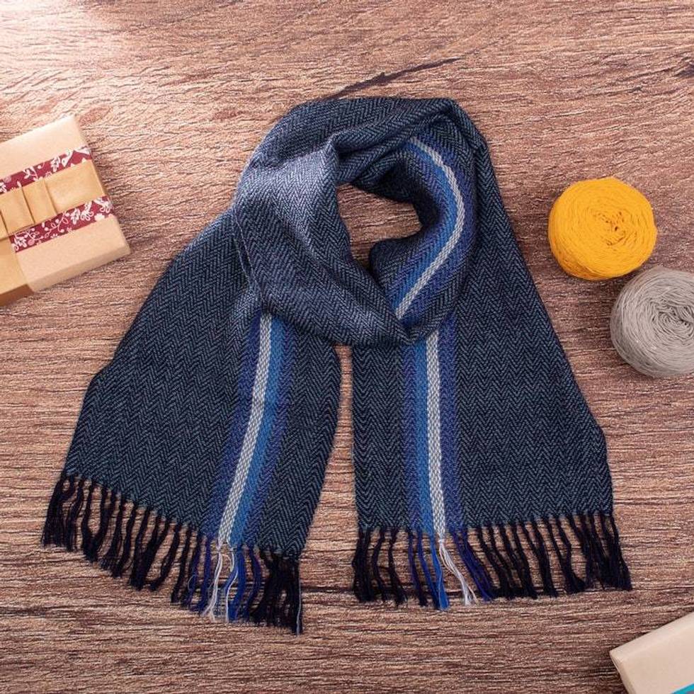 Blue and Ivory 100 Alpaca Striped Scarf Hand-Woven in Peru 'Seabed' Item ID: 2676641650