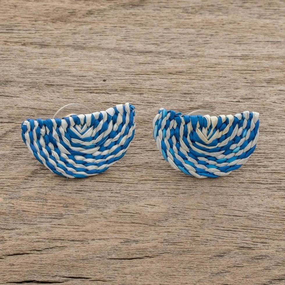 Blue and Ivory Woven Junco Reed Half-Circle Button Earrings 'Creamsicle Swirl' Item ID: 2671777054