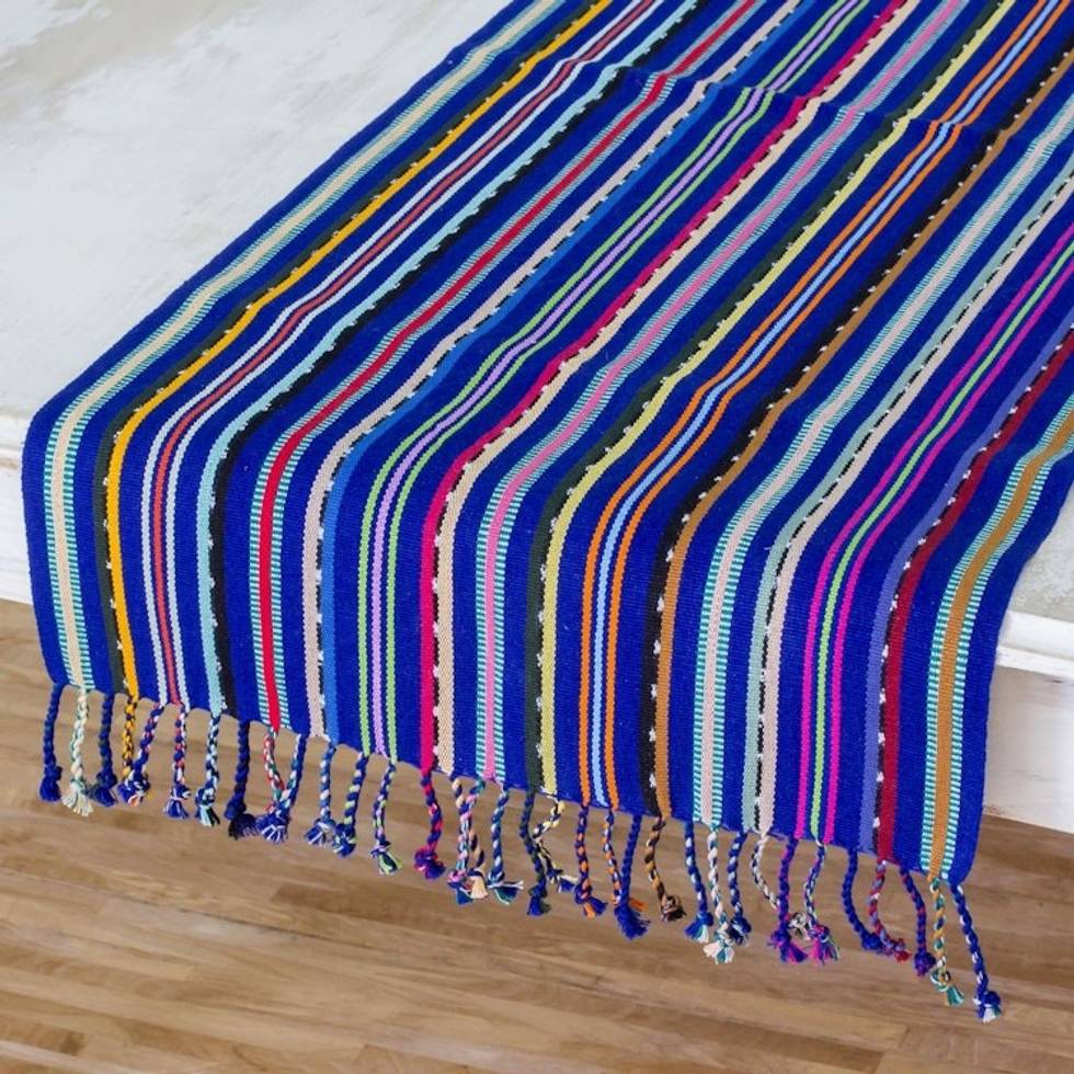 Blue and Multicolored Hand Woven Cotton Table Runner 'Colors of my Land' Item ID: 2671779084