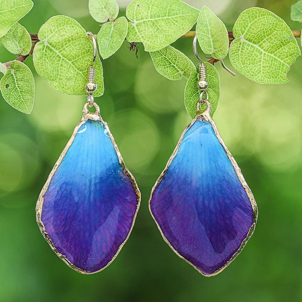 Blue and Purple Orchid 22k Gold-Accented Dangle Earrings 'Oneiric Petal' Item ID: 2671646627