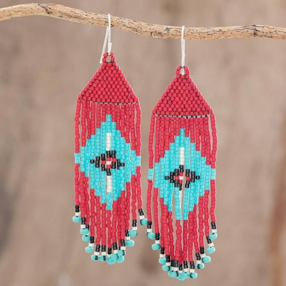 Blue and Red Diamond Pattern Glass Beaded Waterfall Earrings 'Diamond Eyes' Item ID: 2671776732